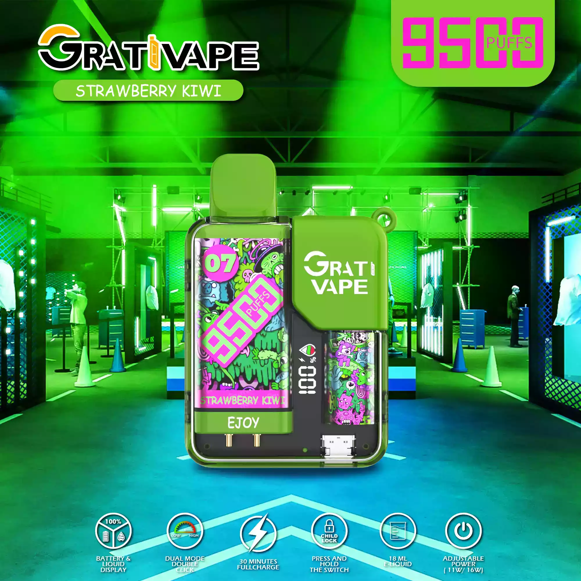 Grativape Ejoy 9500 Puffs Vape usa e getta offre un'esperienza di vaping eccezionale con impostazioni di potenza regolabili, una batteria ricaricabile da 650 mAh e 18 ml di e-liquid di qualità superiore. in Potenzialità di nicotina 0%, 2%, 3% e 5%con sapori decisi come Ghiaccio alla fragola, ananas al mango e gomma da masticare all'anguria.